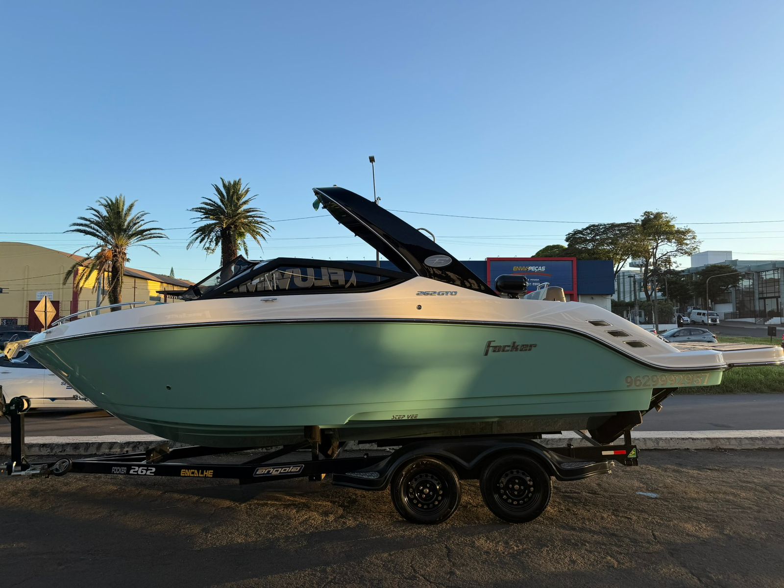Carreta Rodoencalhe Ferro Angola / Toldo Original / Sistema de som Boss 6 auto falantes + 2 bazucas + Subwoofer + Módulo Digital / GPS GARMIN Sonar 4 / Rádio VHF / Guincho Elétrico / Tapete de EVA / Churrasqueira / Guarda Sol / Luz Subaquático / Luzes de cortesia / 2 baterias